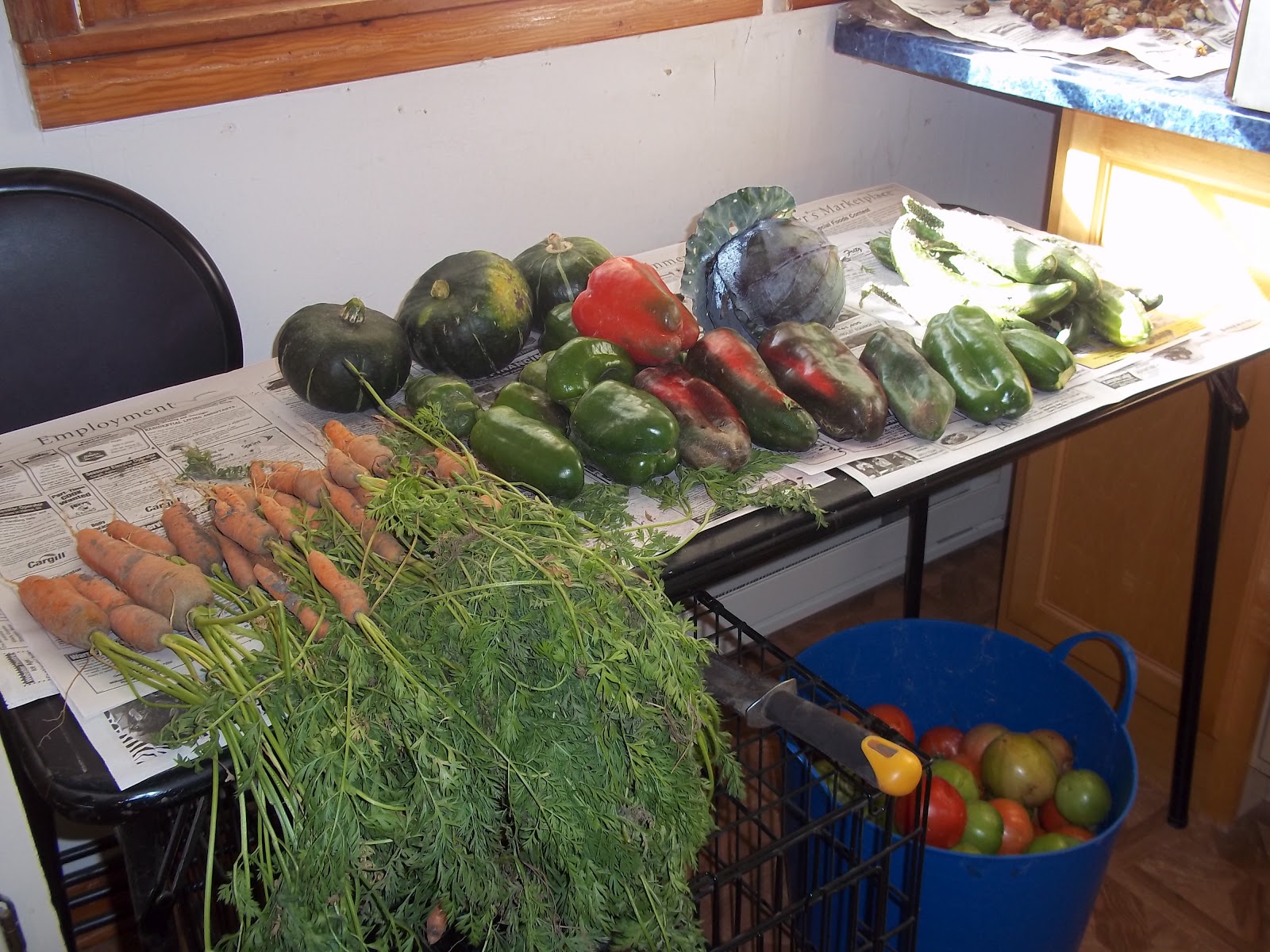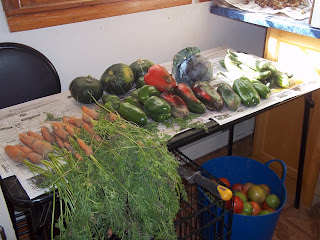 If I am wondering why I am so tired today, the pictures following says it all. It was forcasted for us to have a hard freeze and I was going to save as much as possible. First I needed to pick all of the ripe tomatoes and whatever else. It ended up to be peppers, cucumbers, tomatoes, butternut squash, one zuchinni, one head of cabbage and then I dug up some carrots because I want to make a big batch of vegetable soup.